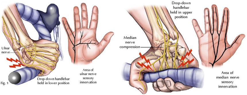 Penyebab mati rasa pada jari kelingking dan jari manis akibat adanya penekanan pada saraf Ulnaris, sedangkan mati rasa pada jari jempol, telunjuk dan jari tengah akibat adanya penekanan pada saraf Medianus. Jangan meremehkan pentingnya masalah genggaman. Bisa pilih handlebar dengan bahan karbon yang lebih bisa meredam getaran jalan daripada aluminium yang lebih kaku.