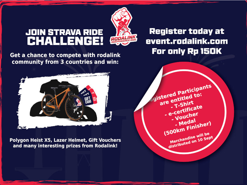 Daftarkan dirimu dalam event ‘Rodalink Independence Ride’ sekarang juga! Cek langsung di event.rodalink.com untuk info dan keterangan lebih lanjut! Ikuti keseruan eventnya dan dapatkan hadiah senilai puluhan juta rupiah!