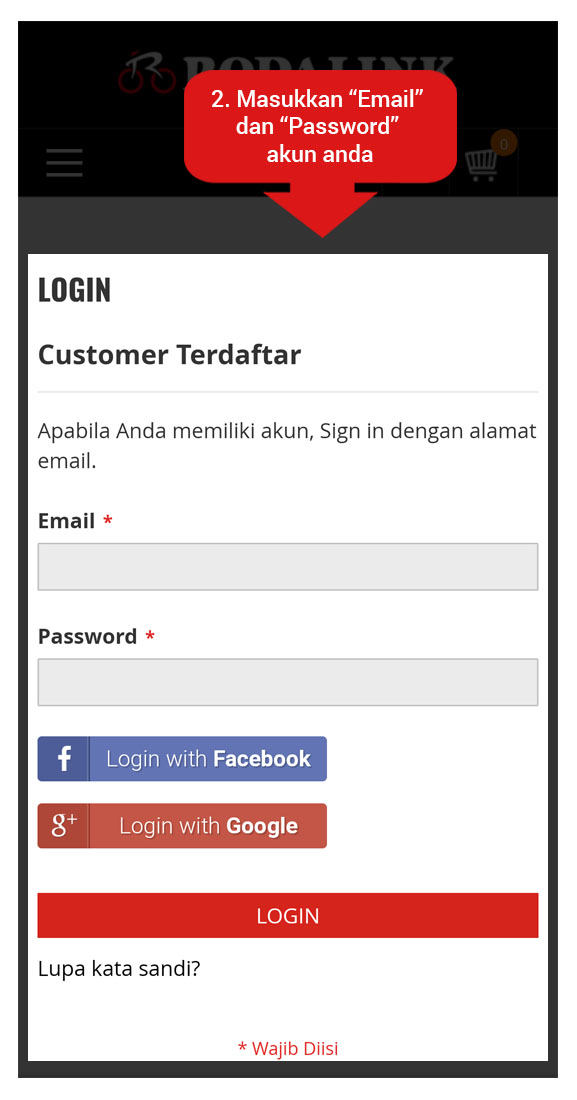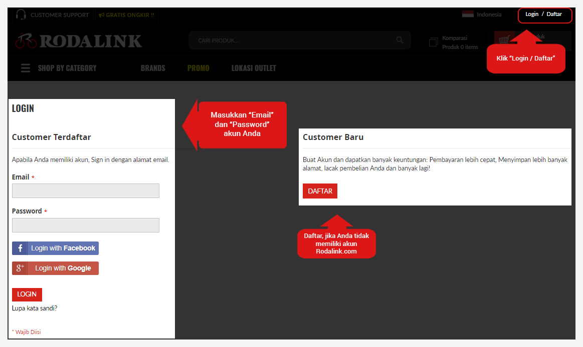 1. Login/Daftar akun di Rodalink.com terlebih dahulu sebelum berbelanja