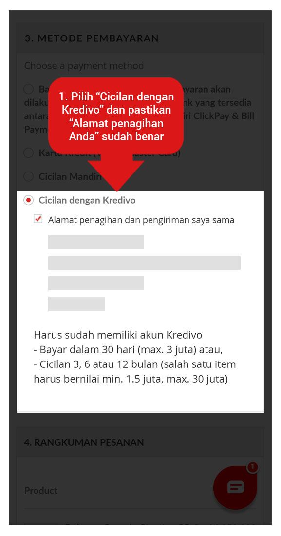 1. Memilih metode pembayaran yaitu "Cicilan dengan Kredivo"