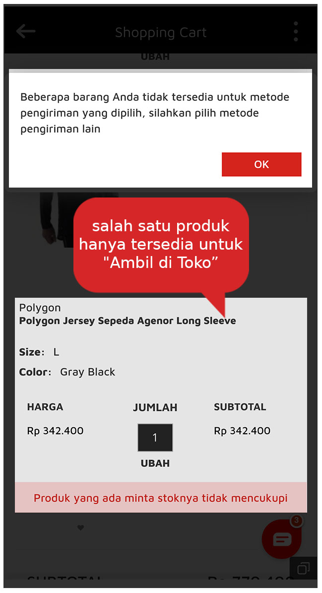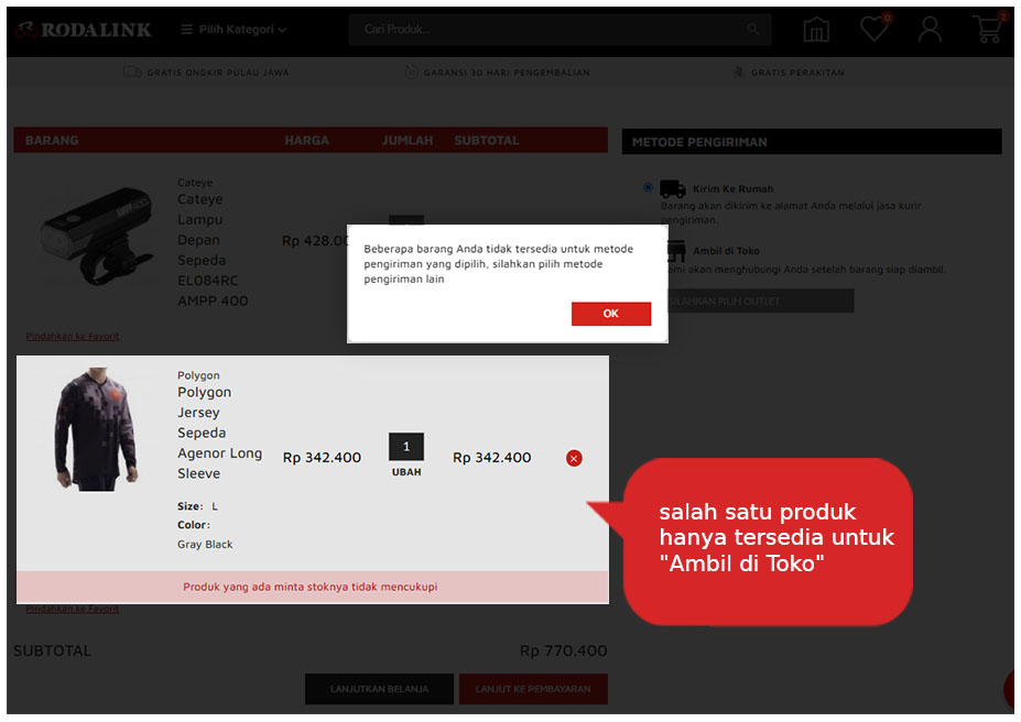 Hal ini disebabkan terdapat salah satu produk dikeranjang belanja Anda yang tidak ready stok di Outlet Rodalink yang Anda inginkan. Anda tetap dapat membeli produk-produk yang Anda inginkan melalui metode "Kirim ke Rumah".
