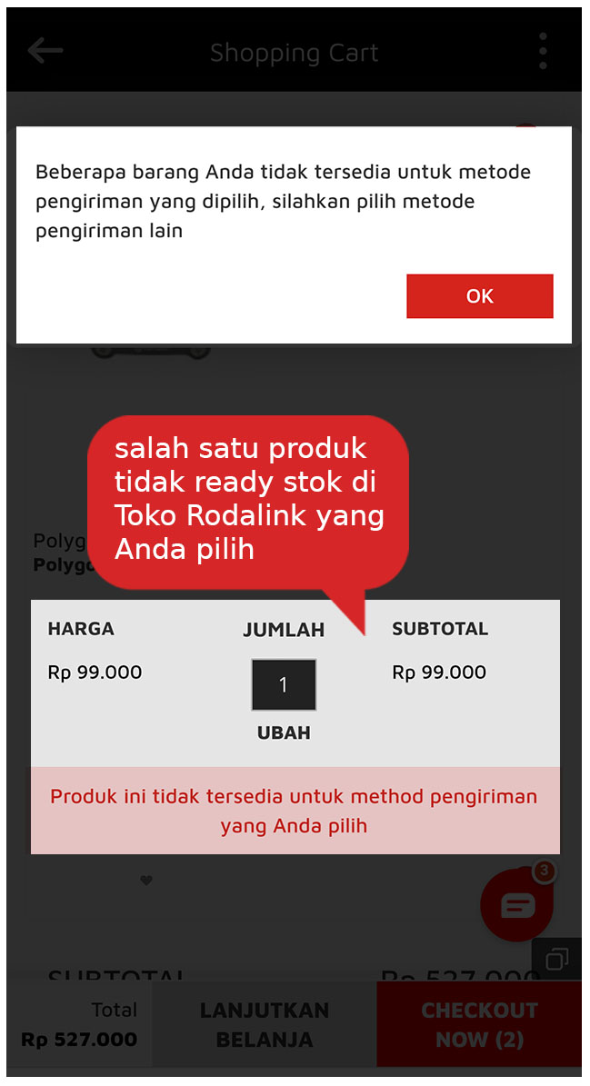 + Versi MobileBerikut pesan informasi jika salah satu produk dikeranjang belanja Anda yang tidak ready stok di Toko Rodalink:+ Versi DekstopBerikut pesan informasi jika salah satu produk dikeranjang belanja Anda yang tidak ready stok di Toko Rodalink:Informasi mengenai stok dapat Anda cek disini.