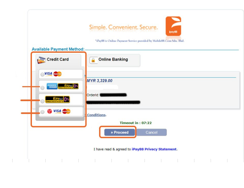 Card Payments are processed throught third party payment gateway providers (Ipay88) and supporting card may vary account countries.Online Banking