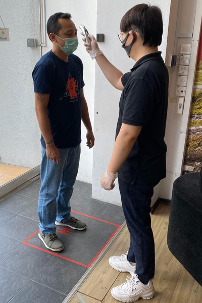 • Entrance glass door will be electronically magnetised. Customers would have to press the doorbell and staff will carry temperature screening, and submit health declaration below upon entry.
